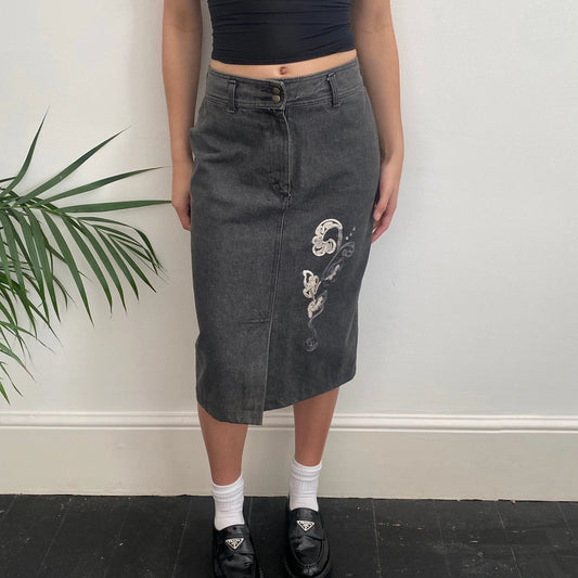 Blooming Midi Denim Skirt - 28W UK 8 Black Cotton