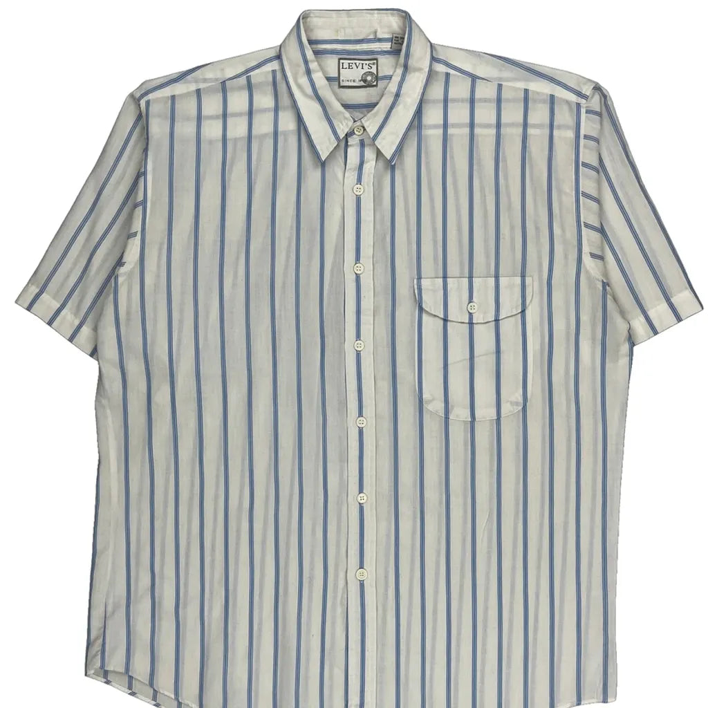 80S/90S Levis Striped Short Sleeve Shirt - Large White Polyester Blend