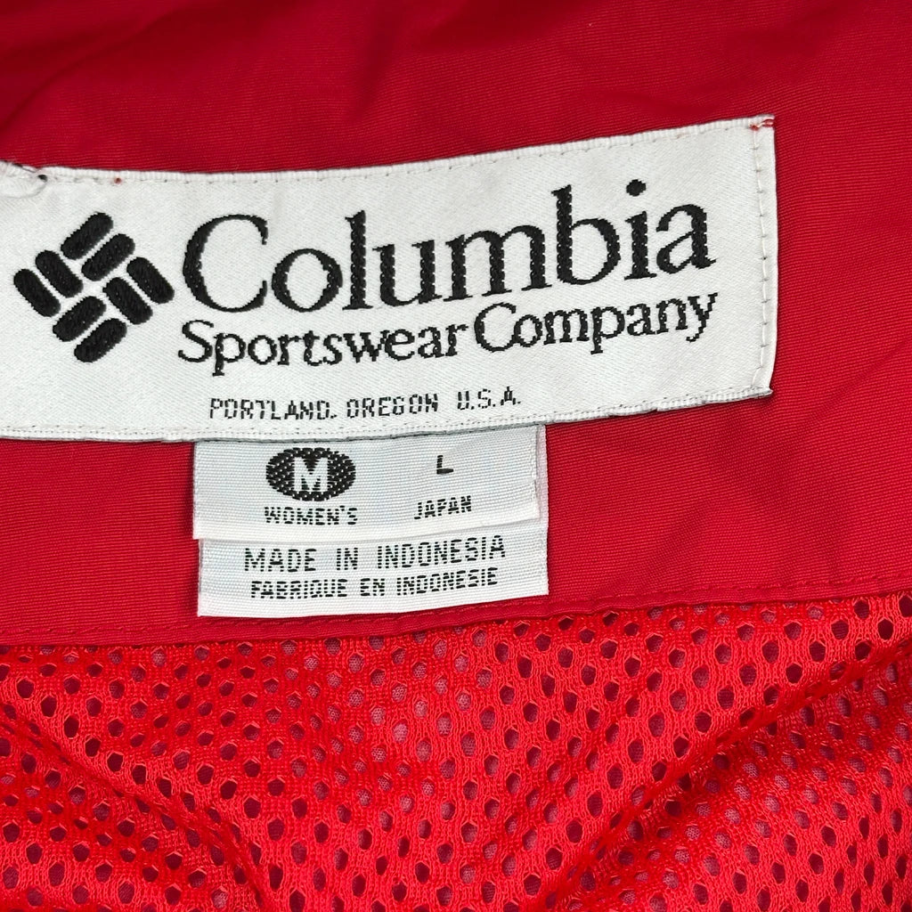 Red And Black Columbia Ski Jacket With Hood And Zipper Closure.