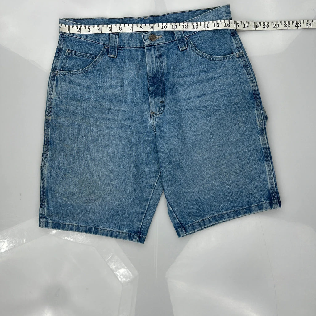 Dickies Denim Shorts, fit a 32″ Waist and 9″ inseam.