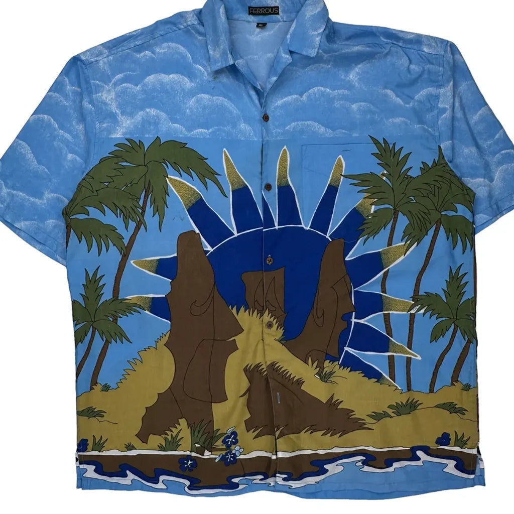 Blue Hawaiian Shirt With Graphic Design Of Palm Trees And Easter Island Statues.