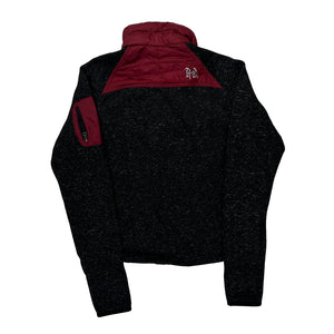 Black And Red Jacket With Quilted Design, Zipper Closure, And Small Logo On Front.