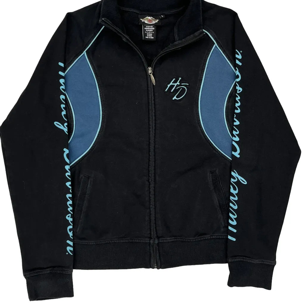Harley Davidson Track Jacket With Blue Accents And Spellout Design