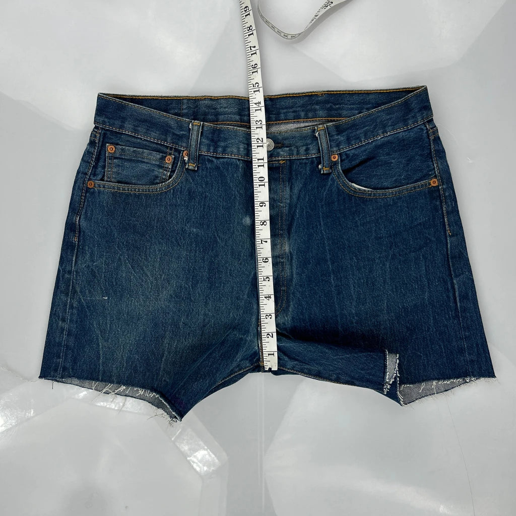 Levis Denim Shorts, fit a 34″ Waist and 9″ inseam.
