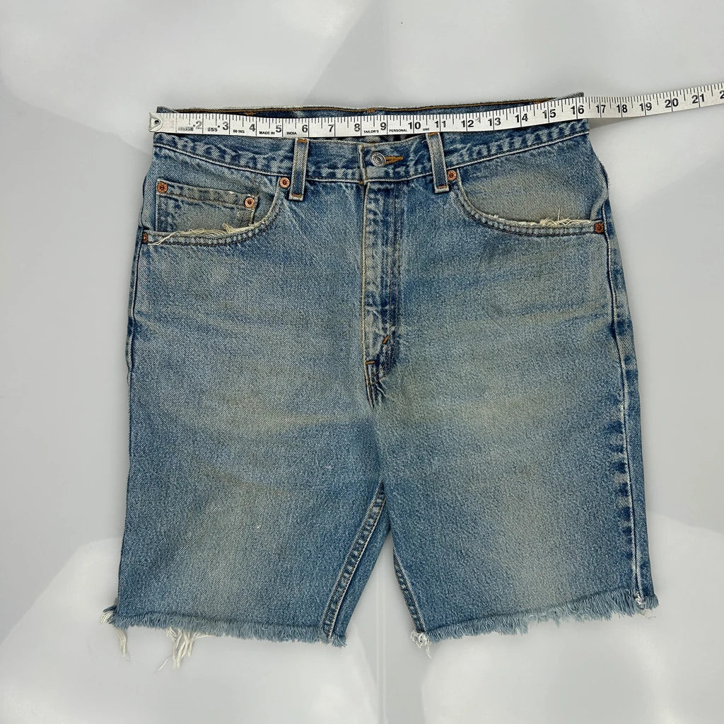 Levis Denim Shorts, fit a 32″ Waist and 9″ inseam.