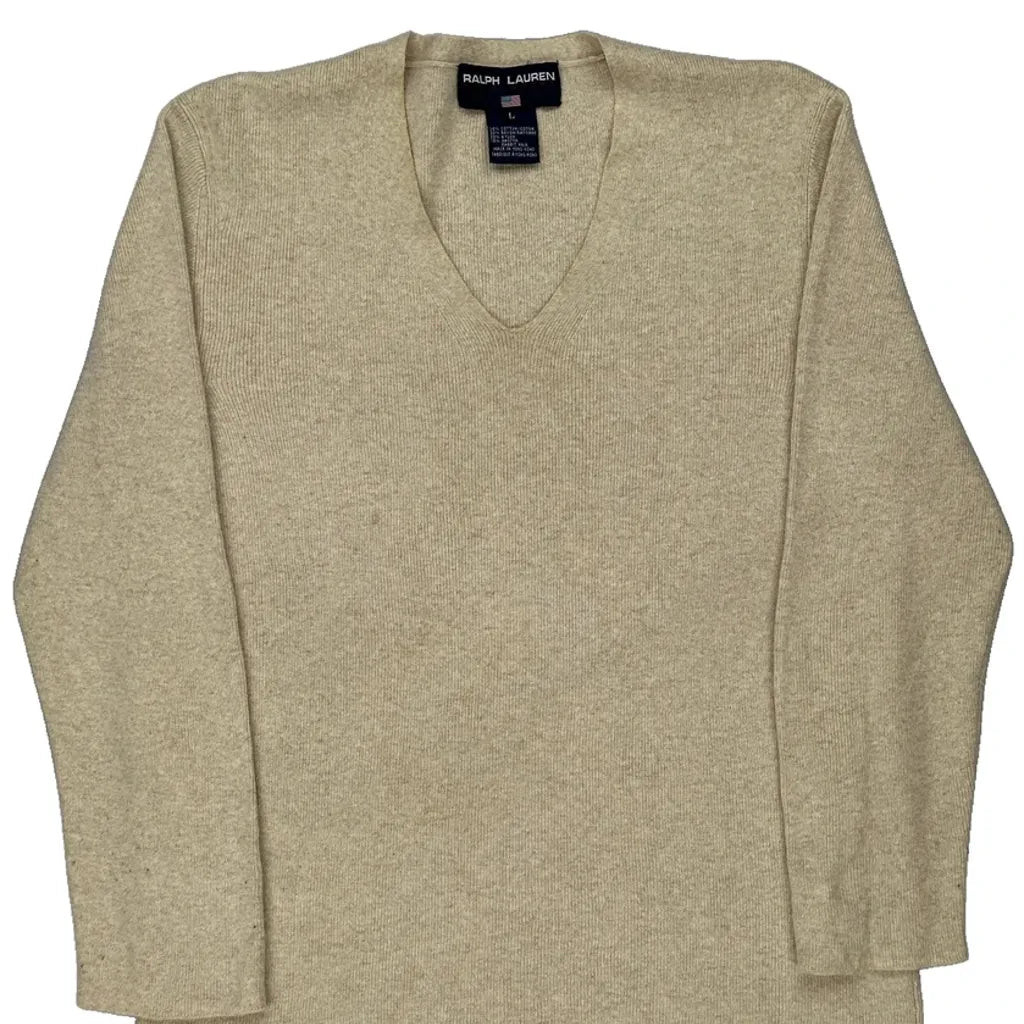 Ralph Lauren V-Neck Jumper - Large Beige Cotton Blend