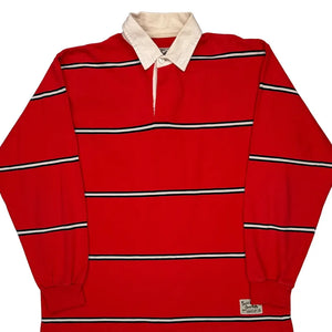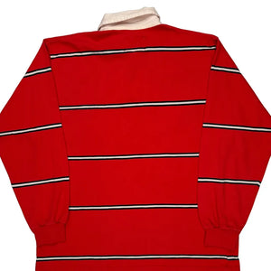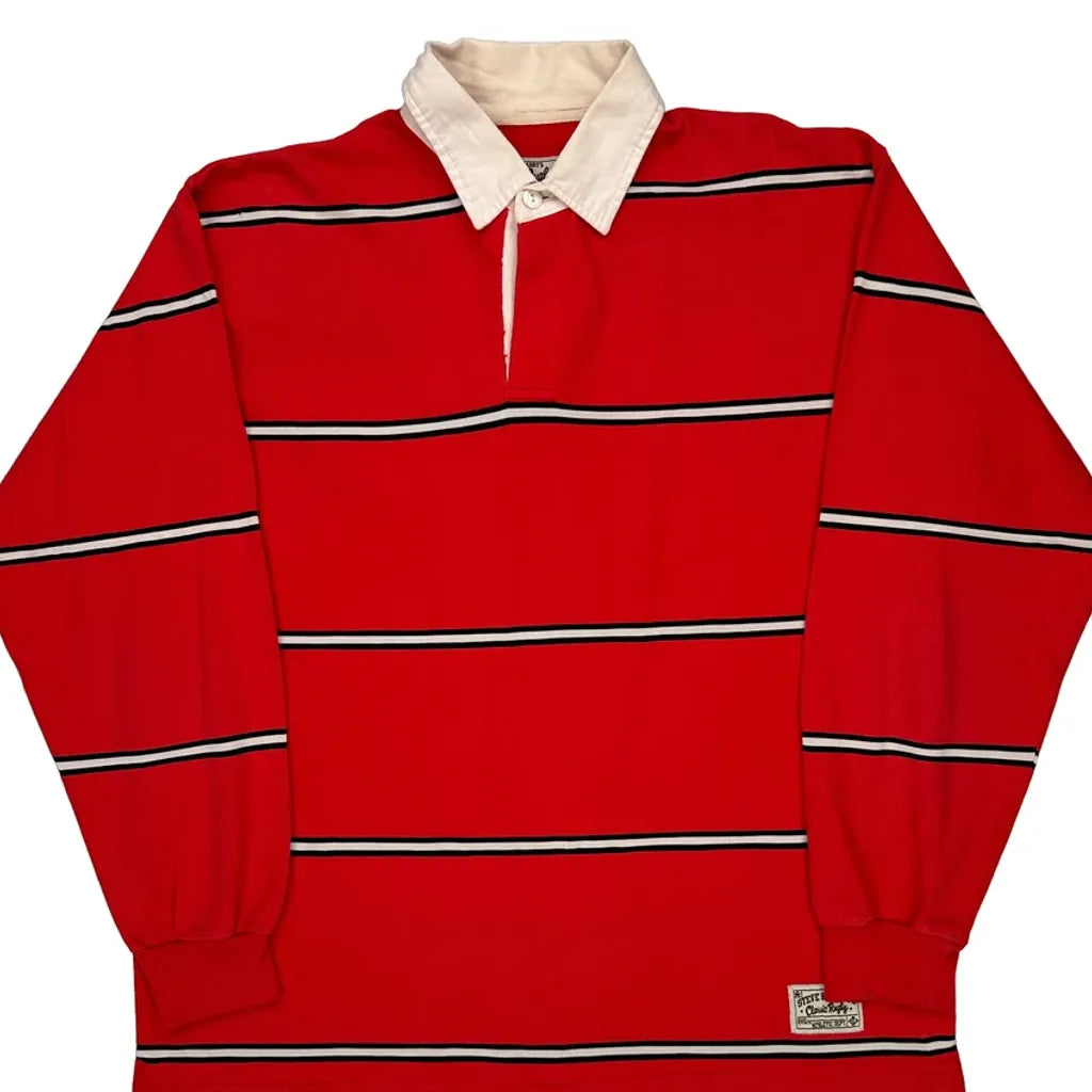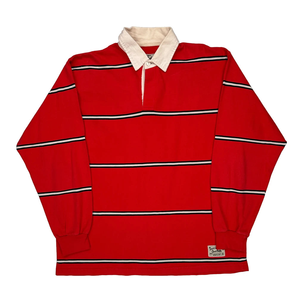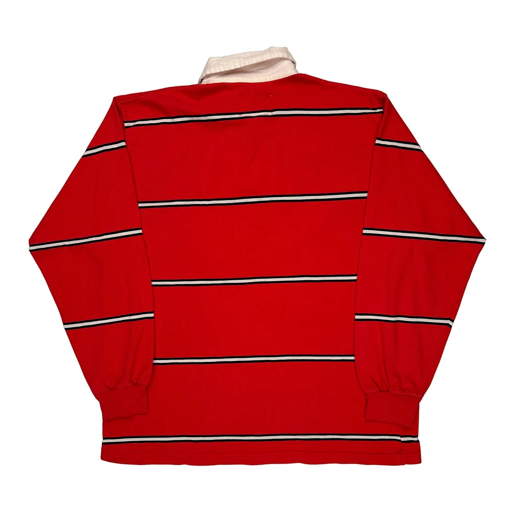 Red Rugby Shirt With White Collar And Black Stripes