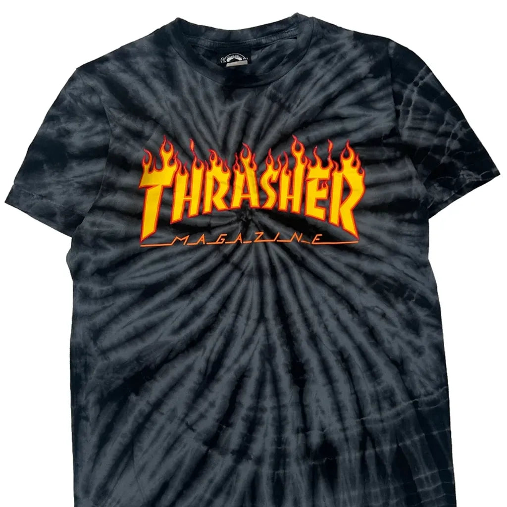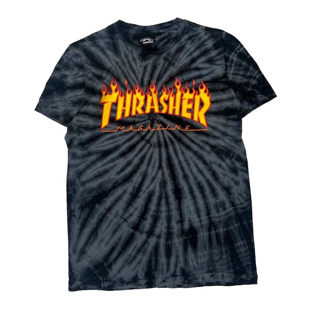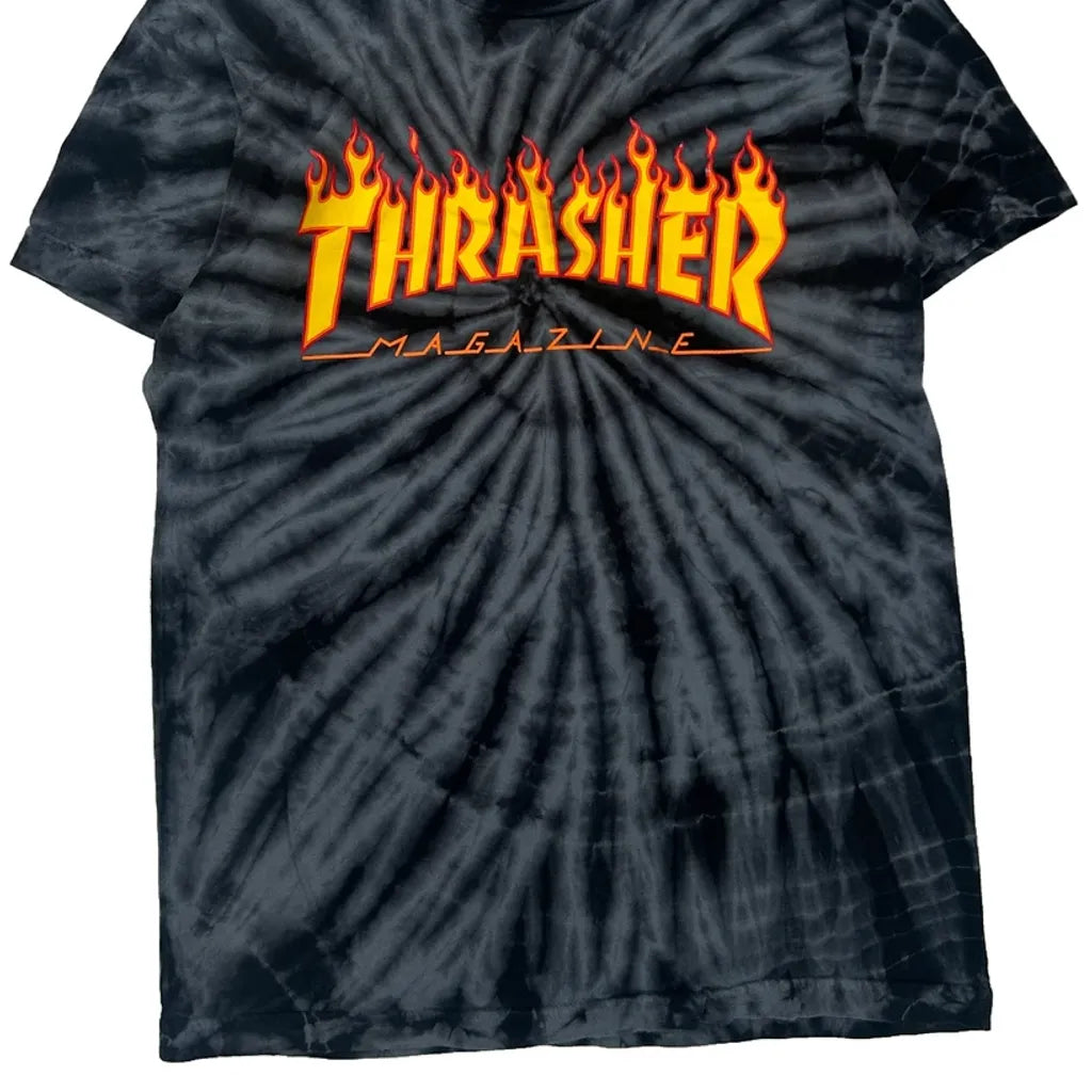 Thrasher Magazine Logo With Flame Design On Black Tie-Dye Background