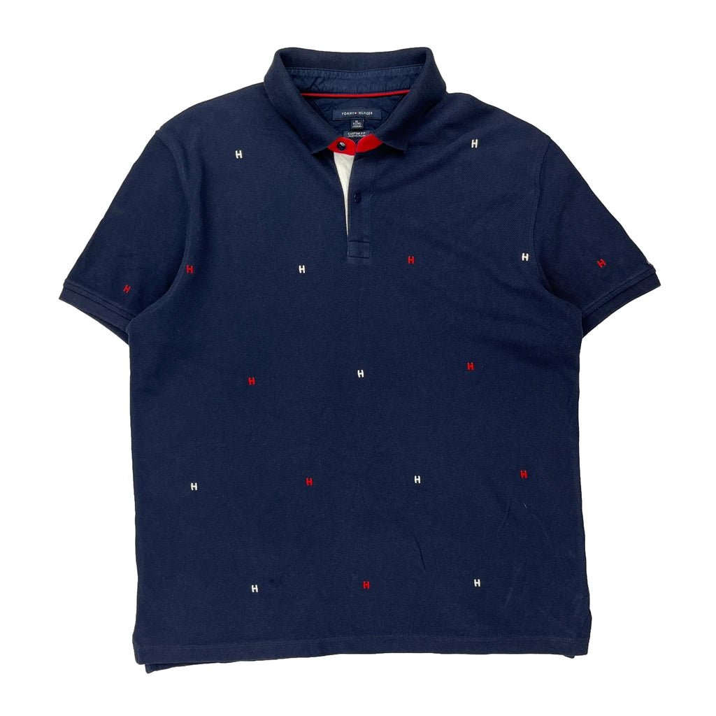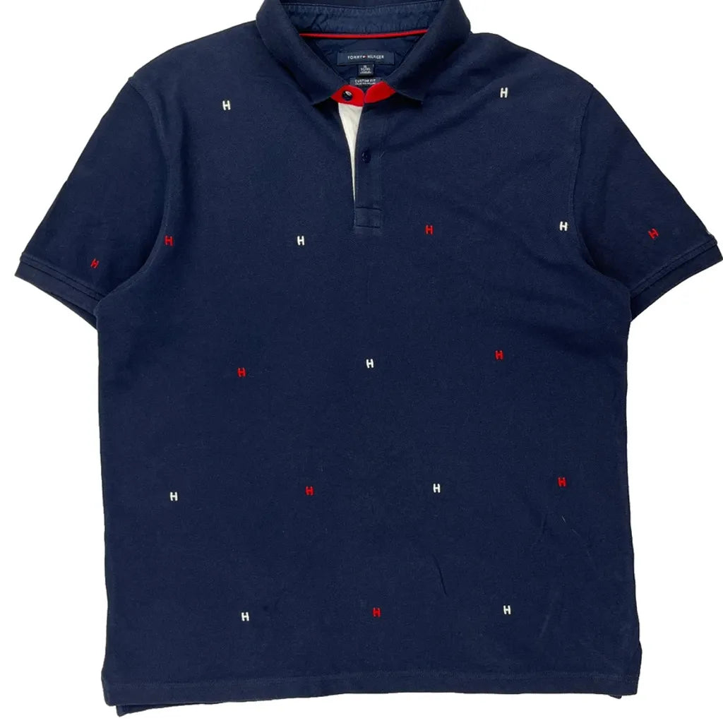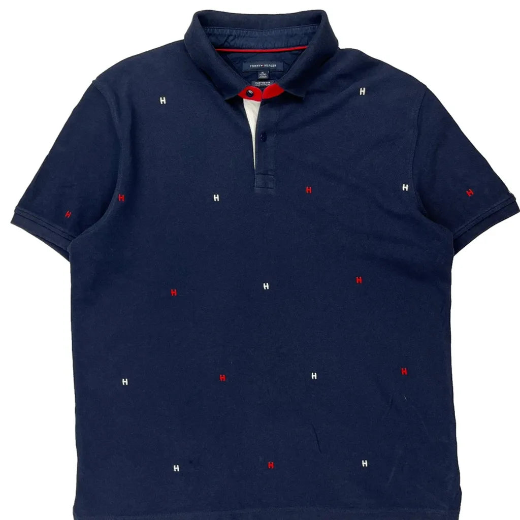 Navy Blue Polo Shirt With Red And White 'H' Pattern