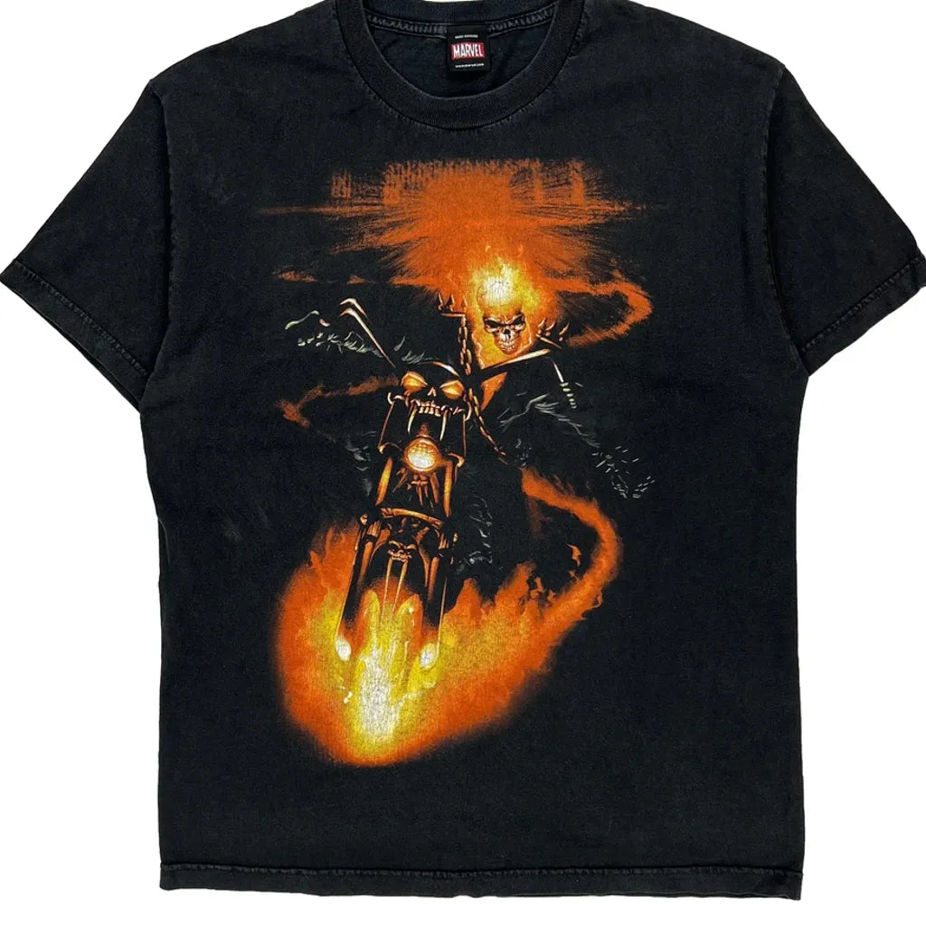 Graphic T-Shirt Featuring A Flaming Motorcycle Rider.